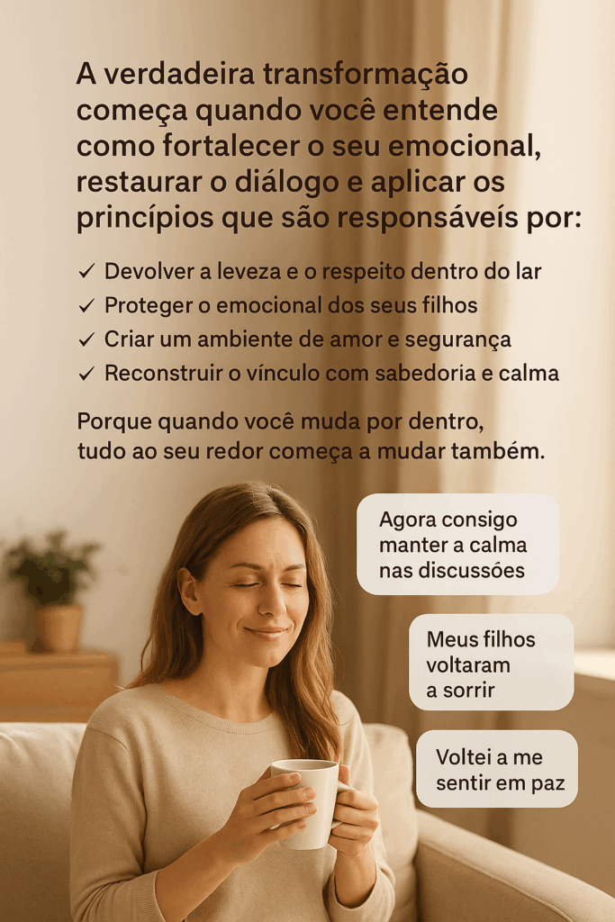 Porque ele não promete mudar o outro — ele te ensina a se fortalecer primeiro, proteger seus filhos e criar um ambiente onde o amor possa renascer naturalmente.